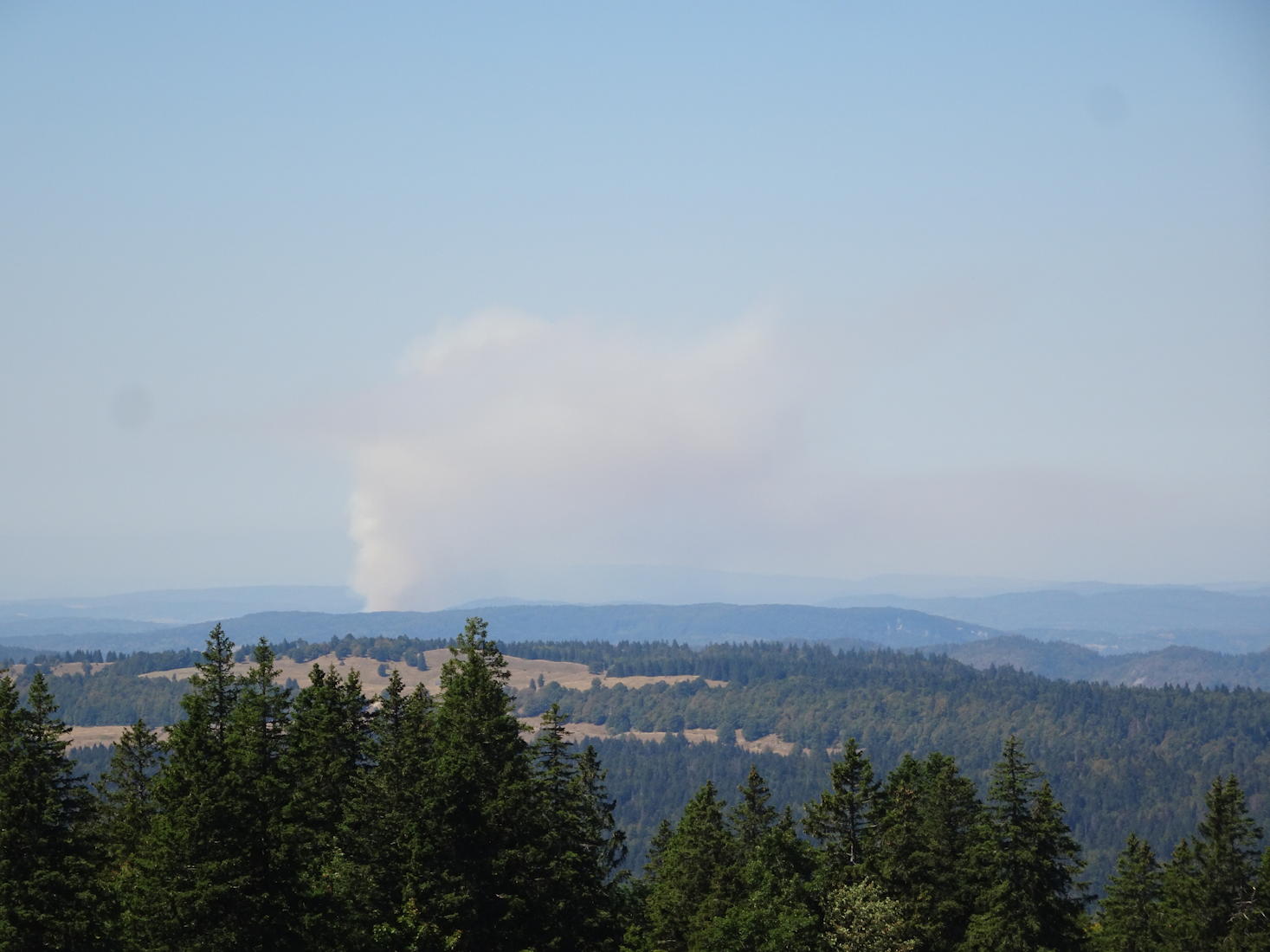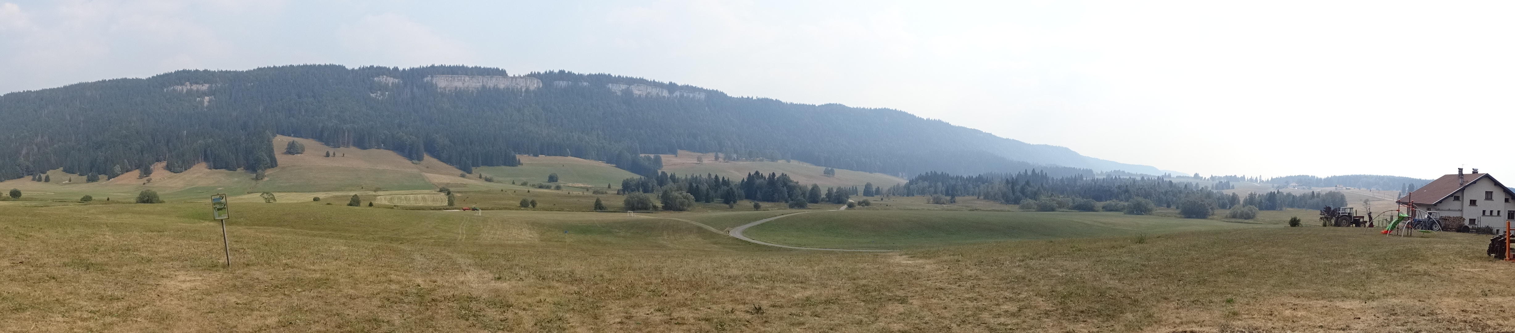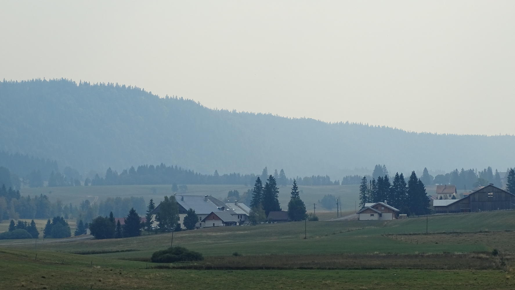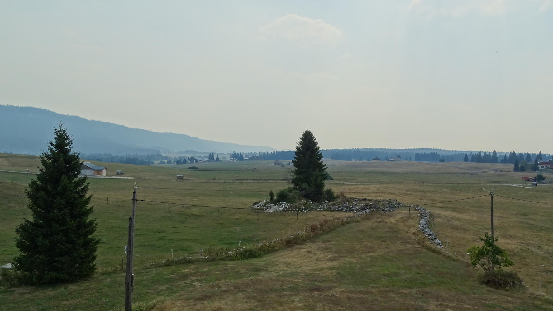 Panorama depuis la Croix du Risoux, la fumée des incendies du bas Jura floute totalement la visibilité