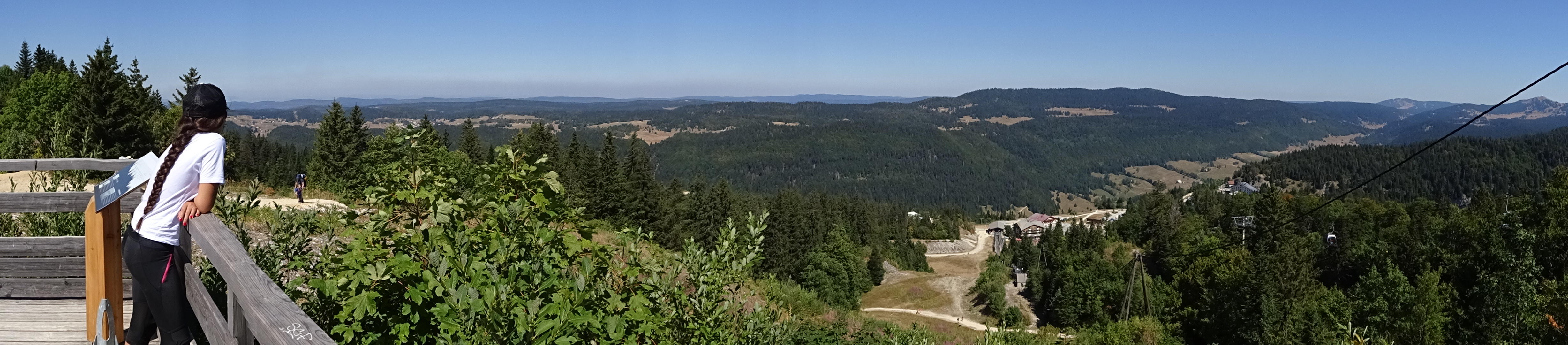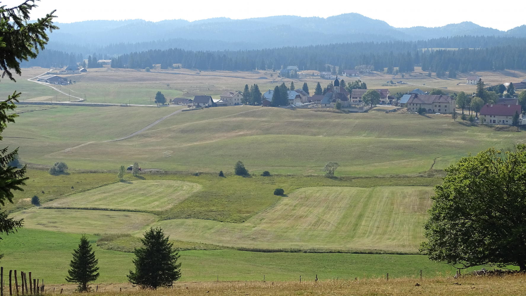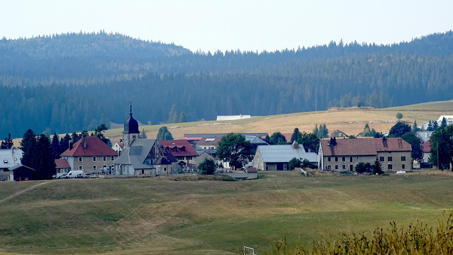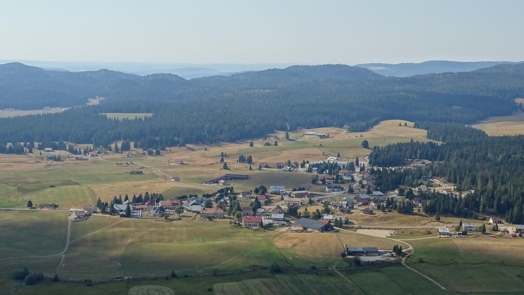 Panorama depuis la Croix du Risoux, la fumée des incendies du bas Jura floute totalement la visibilité