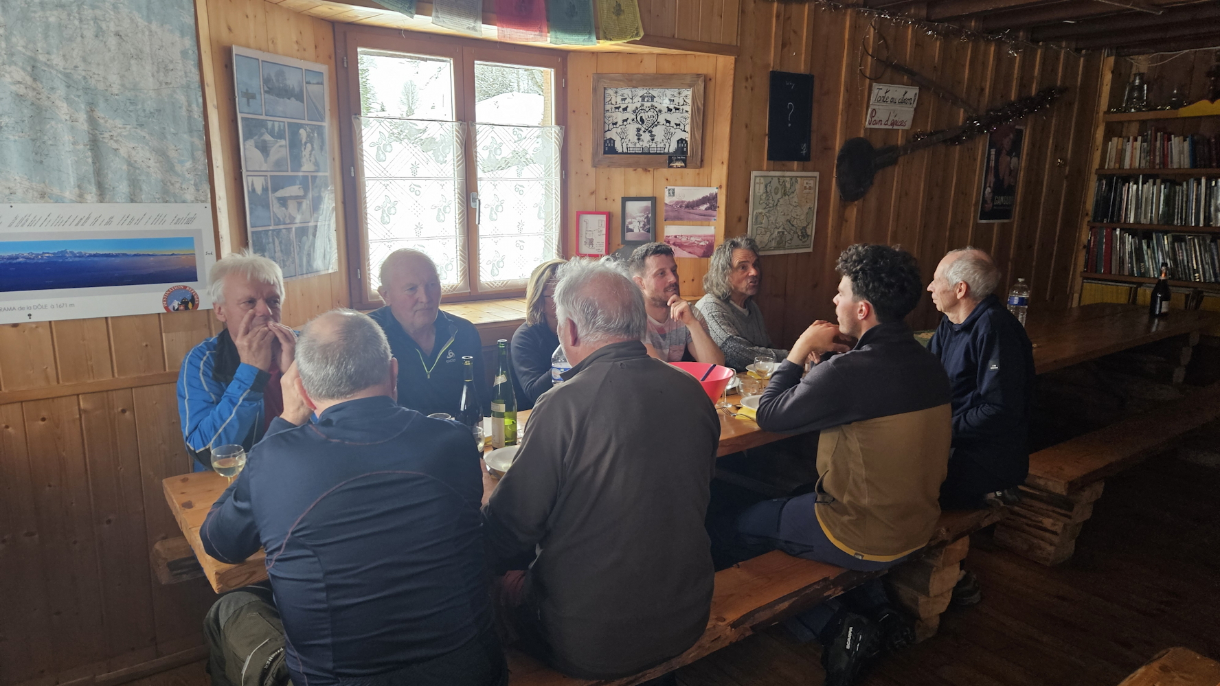 Le service des pistes, anciens et nouveaux, chausse les skis pour monter à notre repas de fin de saison traditionnel